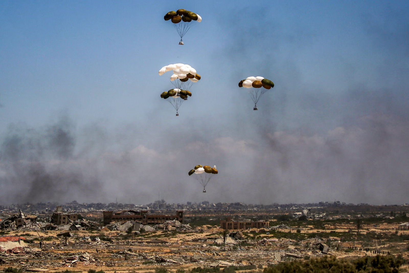Bantuan palet berparasut turun setelah dijatuhkan dari pesawat militer di atas Nuseirat.(foto : The Guardian)