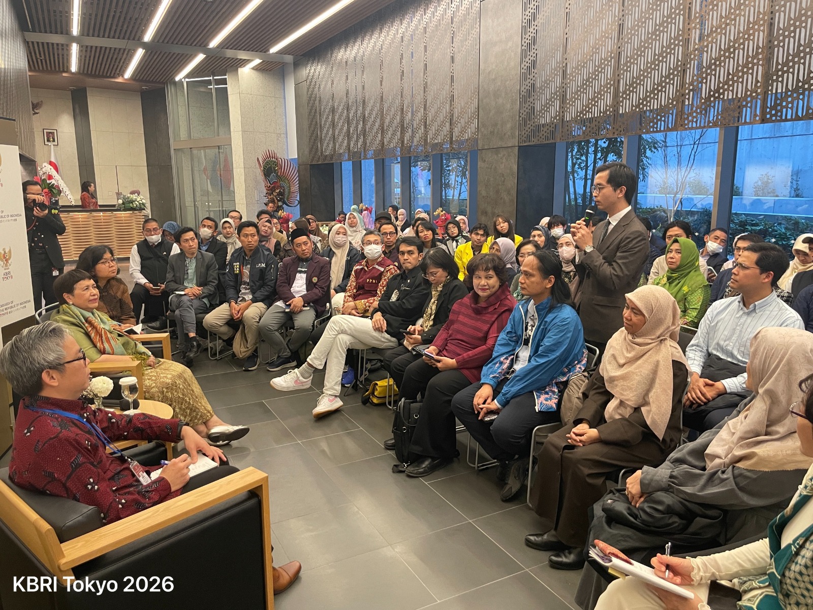 Ia hadir didampingi Wakil Duta Besar Maria Renata Hutagalung, Koordinator Fungsi Penerangan Sosial Budaya KBRI Tokyo Muhammad Al Aula, serta Sekretaris Pertama Fungsi Penerangan Sosial Budaya KBRI Tokyo Iqbal Mohammad Amrullah.