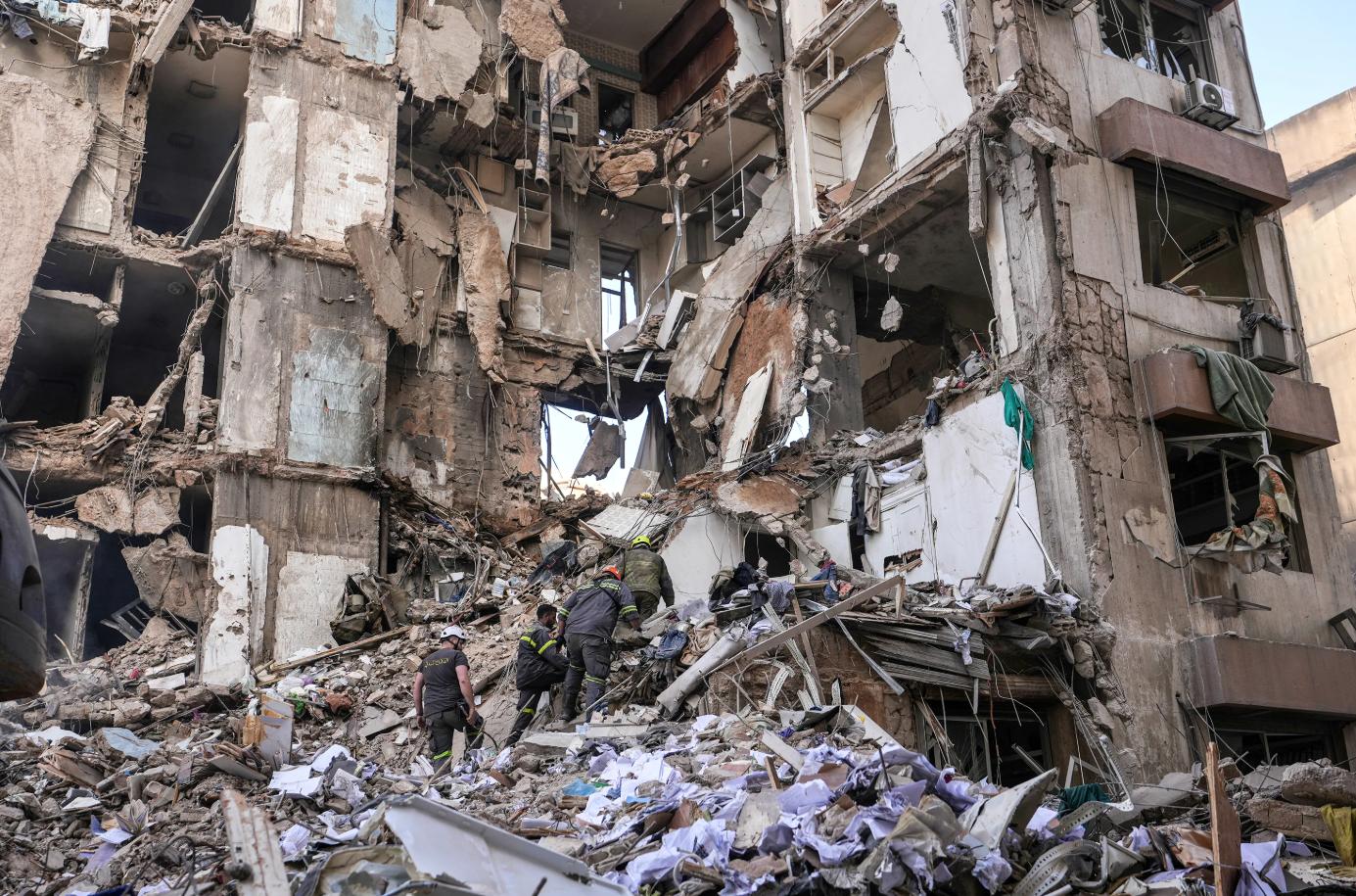 Petugas pemadam kebakaran berupaya memadamkan api di lokasi serangan udara Israel yang menghantam sebuah gedung apartemen di Beirut pada Rabu. (Foto: Bilal Hussein/AP)