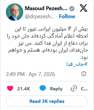 Melalui pernyataan resminya pada hari Selasa 7 April 2026, Pezeshkian mengklaim bahwa lebih dari 14 juta warga Iran telah menyatakan kesiapan mereka untuk berkorban demi mempertahankan kedaulatan negara.